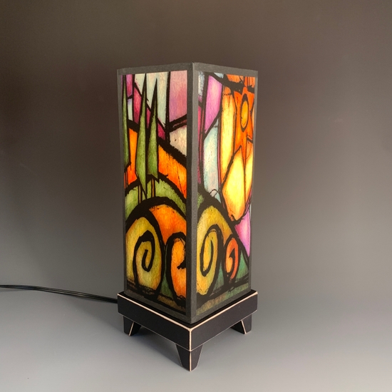 We make these shades from Michael’s art which is then printed on heavy archival art paper and UV coated to last a lifetime without fading. The base is distressed wood.